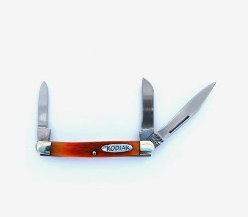 The Jigged Autumn Bone handle of this Bear Knife, 2 7/8″ closed, has brass liners, inlaid Kodiak shield and nickel silver bolsters. The Bear Kodiak Small Stockman Knife with Autumn Bone handle is proudly made in the USA.