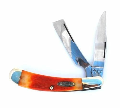 The Jigged Autumn Bone handle of this Bear Knife, 4″ closed, has brass liners, inlaid Kodiak shield and nickel silver bolsters. The Bear Kodiak Razor Knife with Autumn Bone handle is proudly made in the USA.