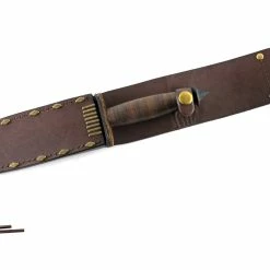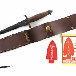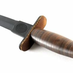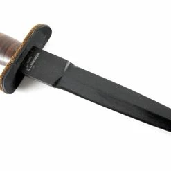 One of the integral pieces of equipment used by the soldiers was the V-42 tactical knife (now known as the Devil’s Brigade knife). Designed with stealth and close-quarters combat in mind, the V-42 is a double-edge blade made of SK-85 carbon steel with black coating. The handle is made of compressed leather discs and features a pointed impact cap on the butt.