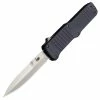 Electrifying California Legal OTF Dual Action Knife (Black) This California Legal OTF Knife features a durable construction aluminum black finished handle with finger grip on the spine and belly with a dual action opening and closing push button. It comes with a drop point, satin finish, stainless steel blade with a sharp edge and blood groove. Overall length is 5.25 inches.