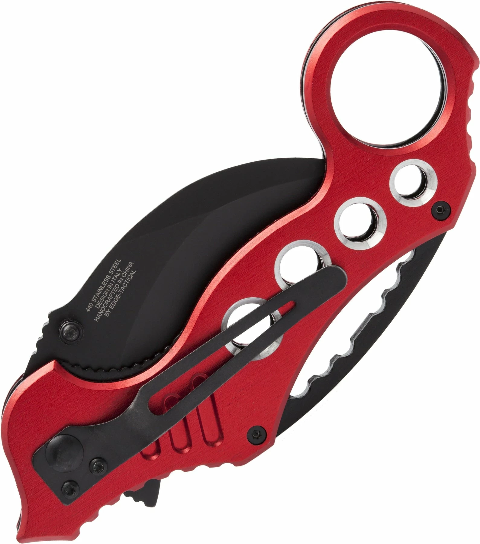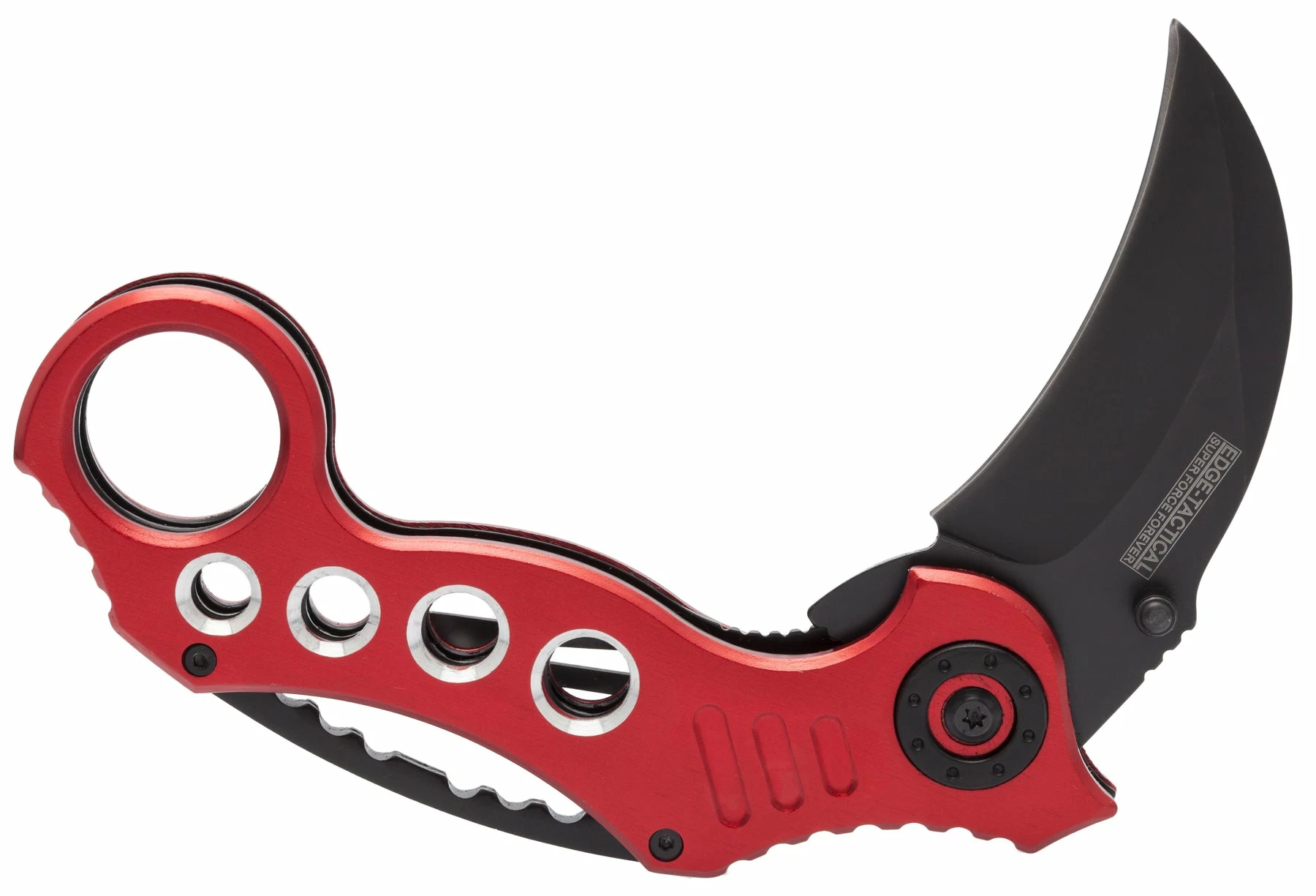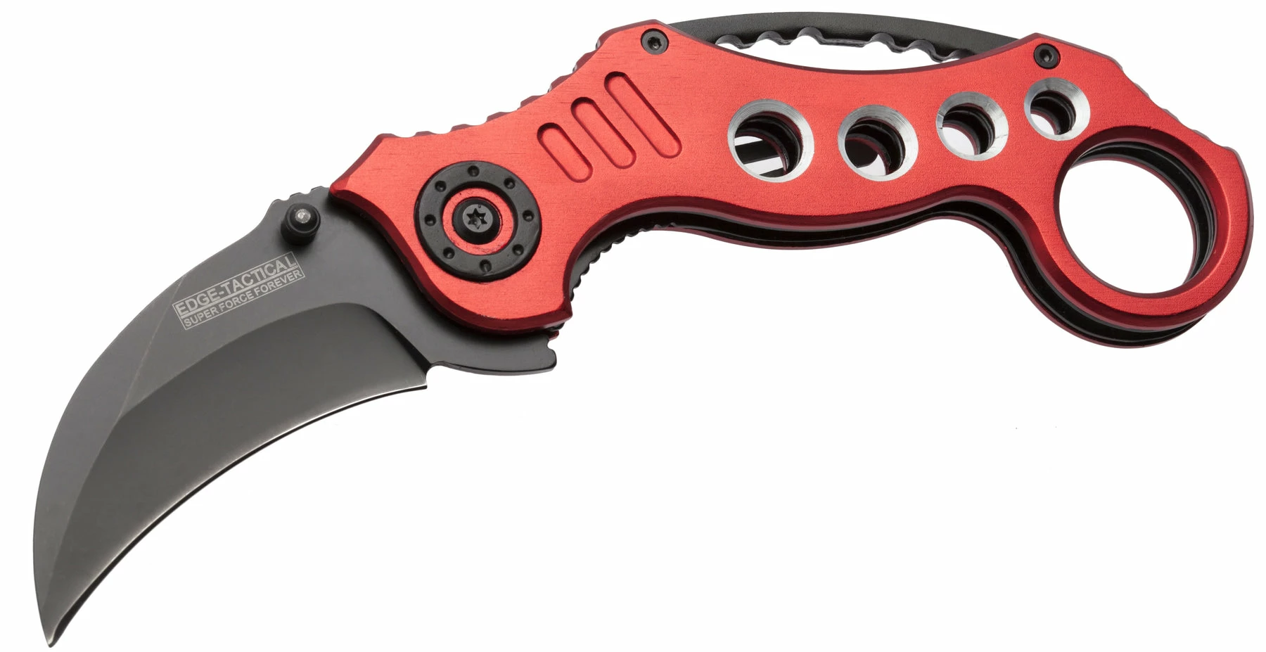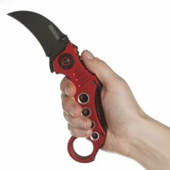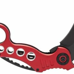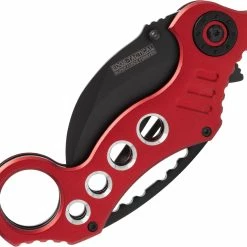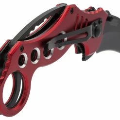 The Tactical Extreme Karambit Knife has a super sharp blade made of 440 stainless steel that has been heat treated and powder coated black. With both a thumb stud and thumb rest integrated into the blade design, the blade also features a solid assisted opening feature and steel locking spring to hold the blade open. The handle of the Tactical Extreme Karambit Knife has a steel liner and solid aluminium grips that are anodized red. Has a finger hole as well.