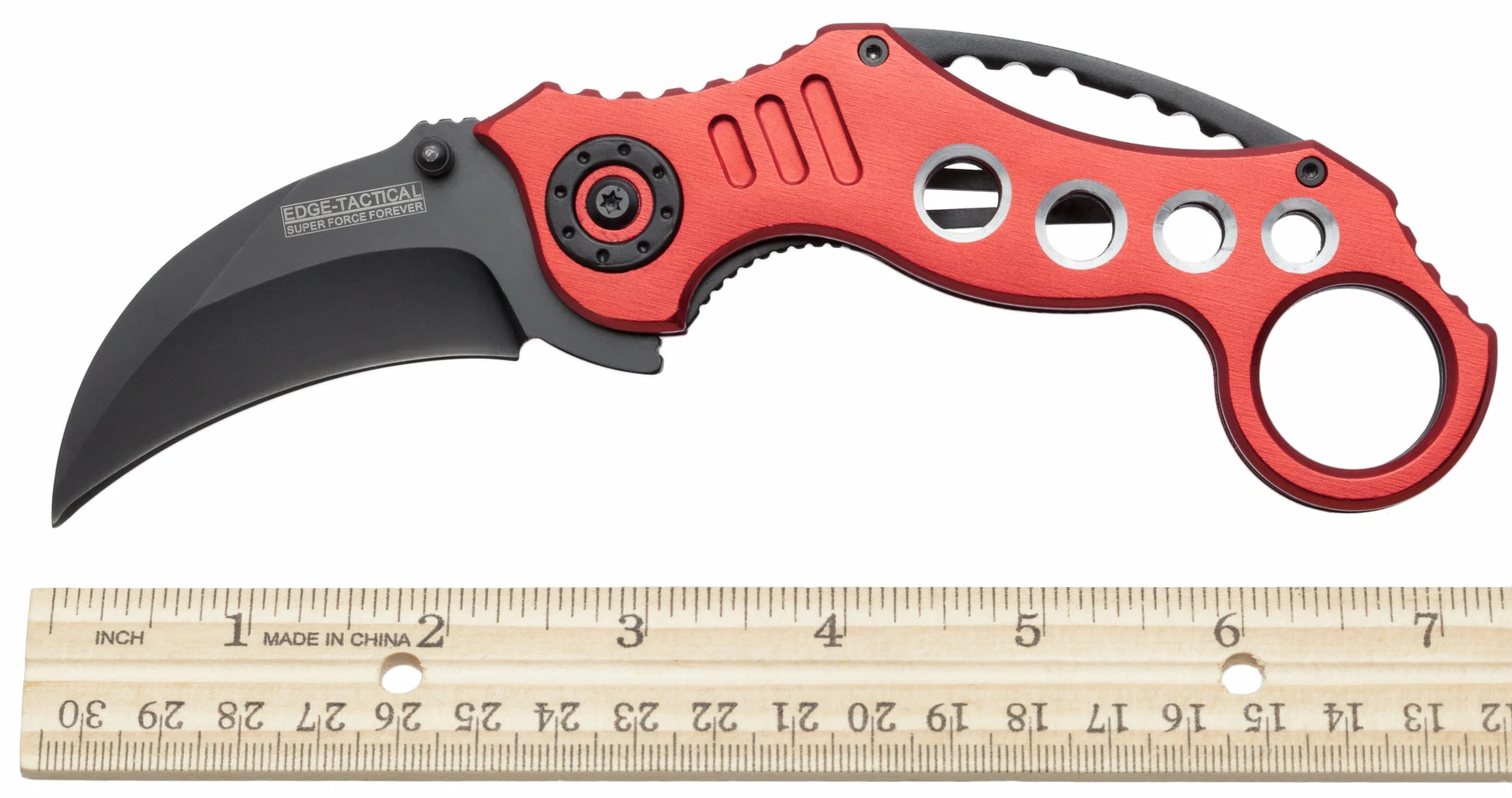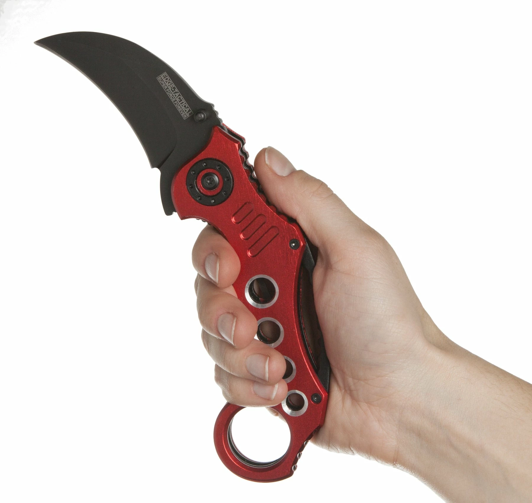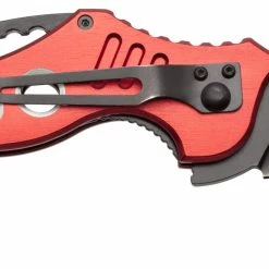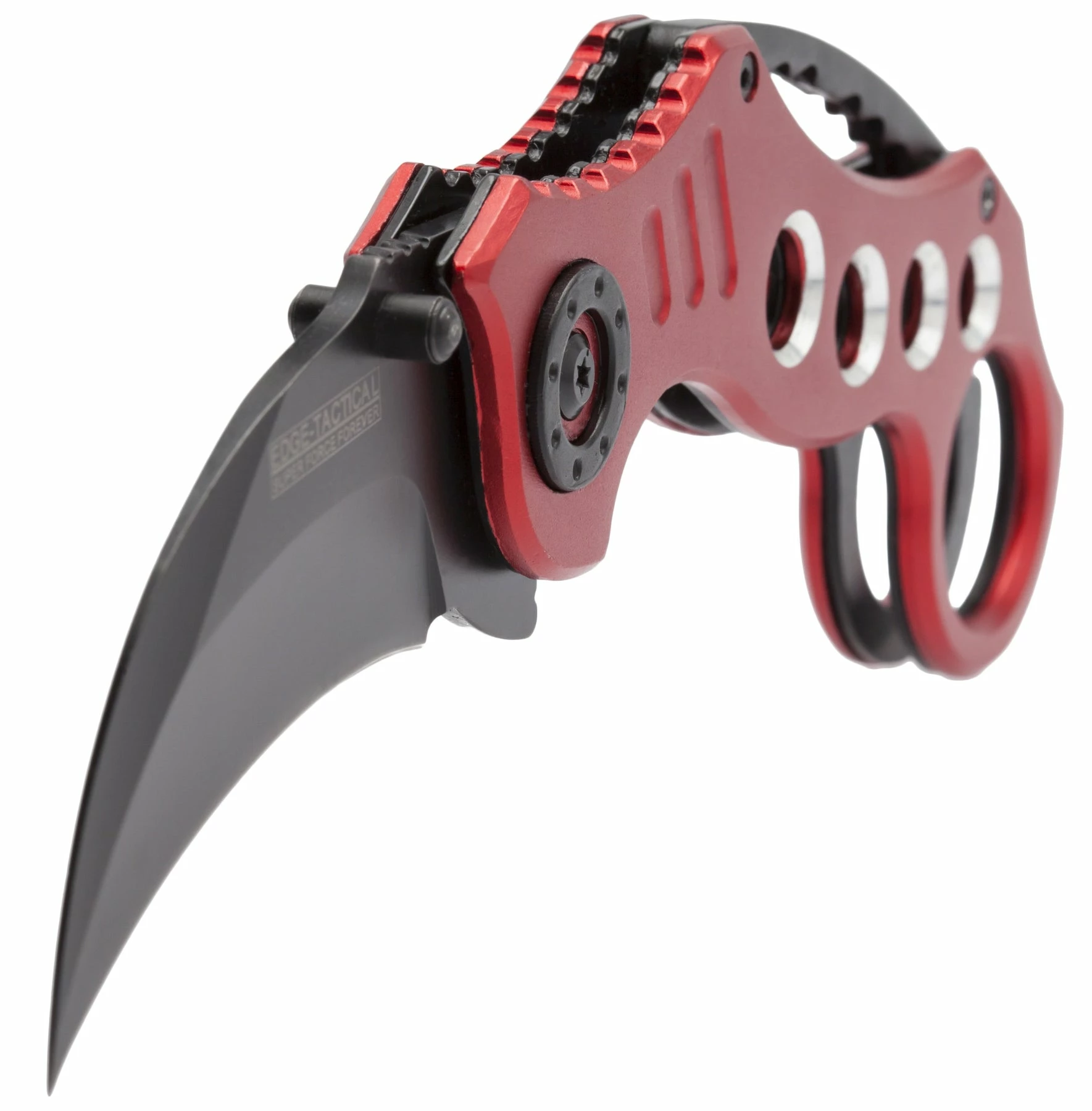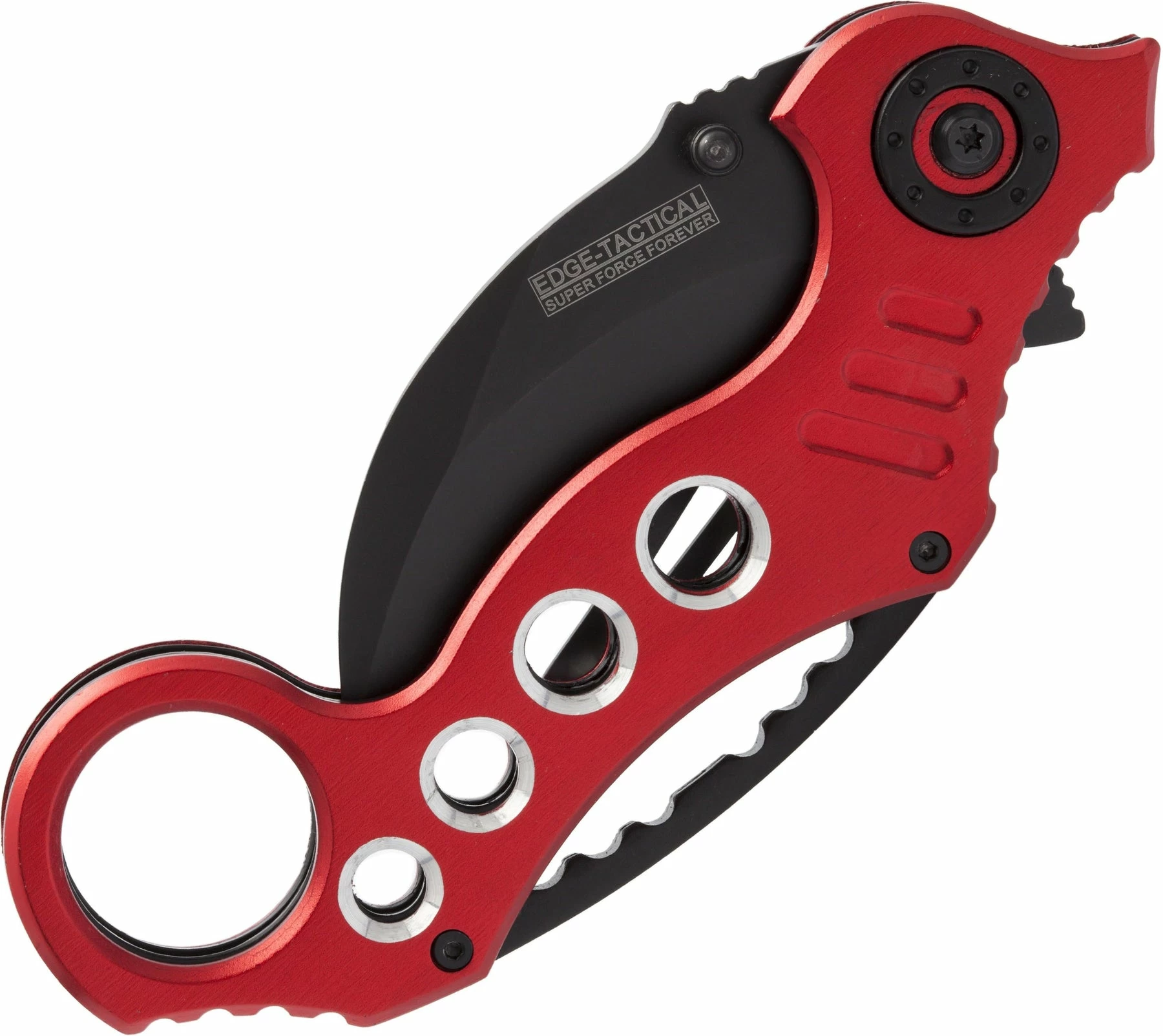 The Tactical Extreme Karambit Knife has a super sharp blade made of 440 stainless steel that has been heat treated and powder coated black. With both a thumb stud and thumb rest integrated into the blade design, the blade also features a solid assisted opening feature and steel locking spring to hold the blade open. The handle of the Tactical Extreme Karambit Knife has a steel liner and solid aluminium grips that are anodized red. Has a finger hole as well.
