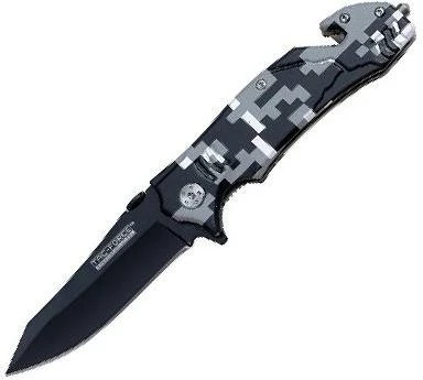 This piece is an attractive companion for work or leisure. This digital snow camo tactical rescue spring assisted knife is easy to deploy. Featuring glass breaker and cord cutter on handle. Includes pocket clip and it is 4 1/2 Inch overall closed in length.