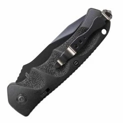 The Etreme Survival series automatic knife is a heavy duty side-opener featuring a 440c stainless steel blade and black anodized aluminum handle, pocket clip and glass breaker.
