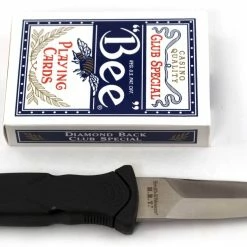 The full tang blade stretches 3.5 inches long and features dual-sharpened edges that culminate in a piercing spear point. Its steel is functional 7Cr17 high carbon stainless steel, an alloy that’s resistant to corrosion and easy to maintain.
